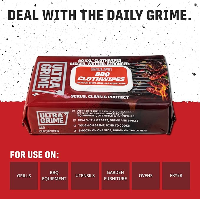 Ne puščajte za seboj nobene maščobe ali zažgane umazanije – uporabite UltraGrime BBQ robčke! Naša posebna formula vsebuje vitamin E in aloe vero za zaščito vaših rok, medtem ko učinkovito odstranjuje maščobo in nečistoče z rešetk ter razgrajuje najbolj trdovratne ostanke. Ti robčki so večji, debelejši in vzdržljivejši od drugih robčkov, in zahvaljujoč posebni formuli za razmaščevanje delo opravijo hitreje in učinkoviteje.