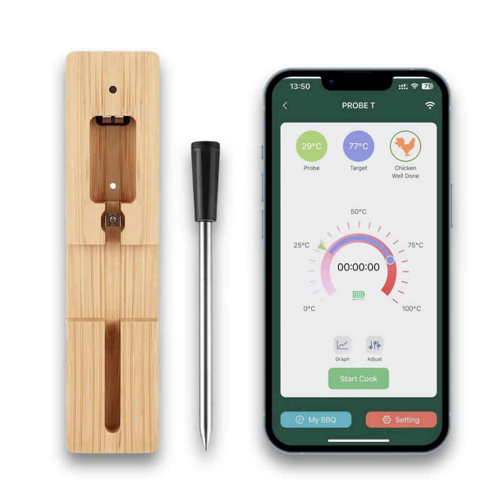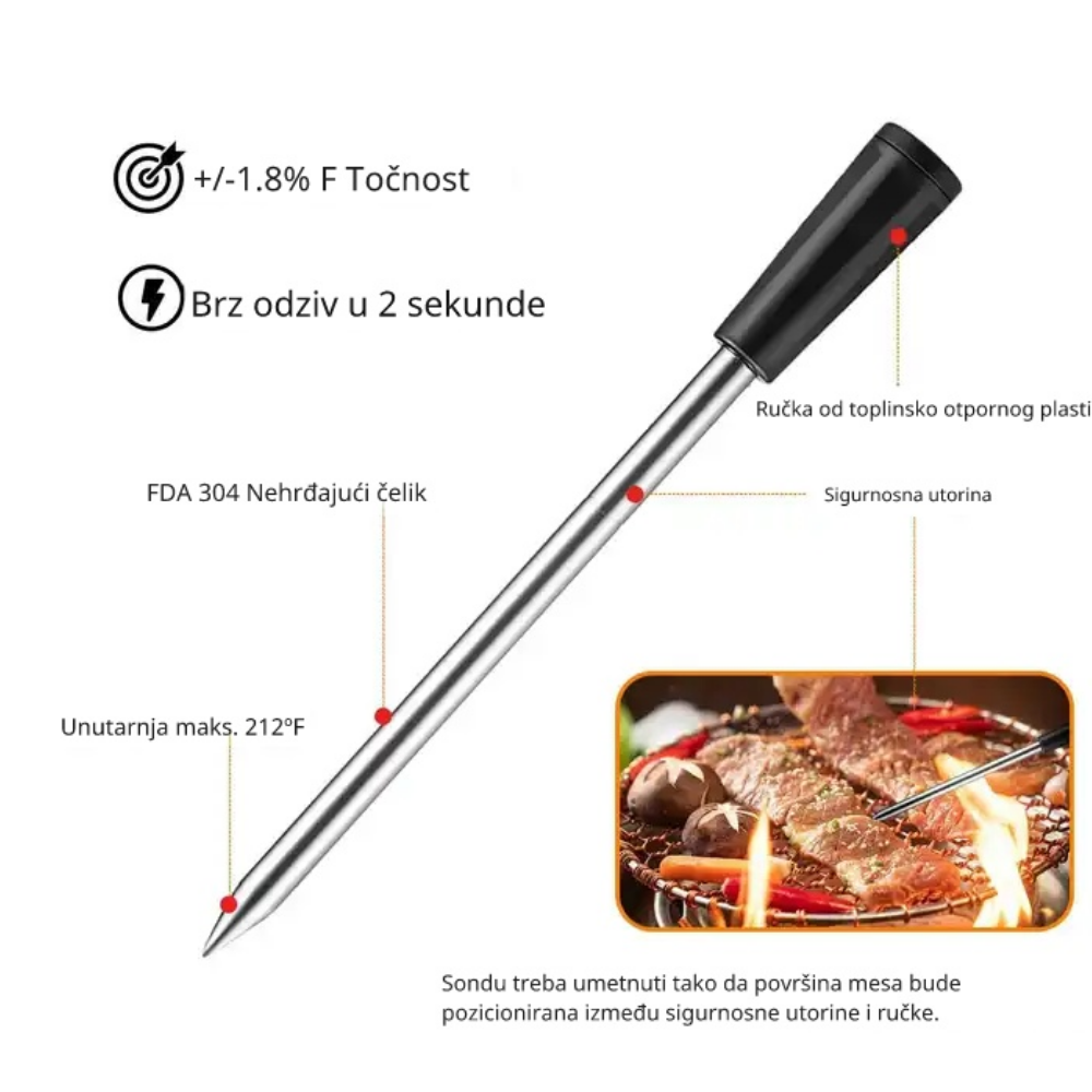 Digitalni brezžični termometer-sonda za merjenje temperature notranjosti zrezkov. Z dodatno aplikacijo priprava sočnih zrezkov postane lažja, zrezki pa bližje popolnosti.